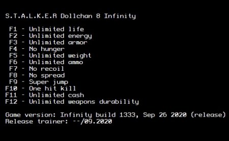 S.T.A.L.K.E.R.: Dollchan 8 Infinity это мод который продолжает сюжетную линию основных частей Сталкер. Кроме нового сюжета, модификация дает игрокам возможность выполнять дополнительные миссии. В игру добавлено множество персонажей со своими особенностями и уникальными заданиями, также добавлены новые локации, новая графика и добавили быструю установку. К сожалению мод не очень легкий и чтобы облегчить прохождение можно использовать трейнер для Dollchan 8. Трейнер/Trainer (+12) {LIRW / GHL} (Трейнер, Читы для Dollchan 8 Infinity)